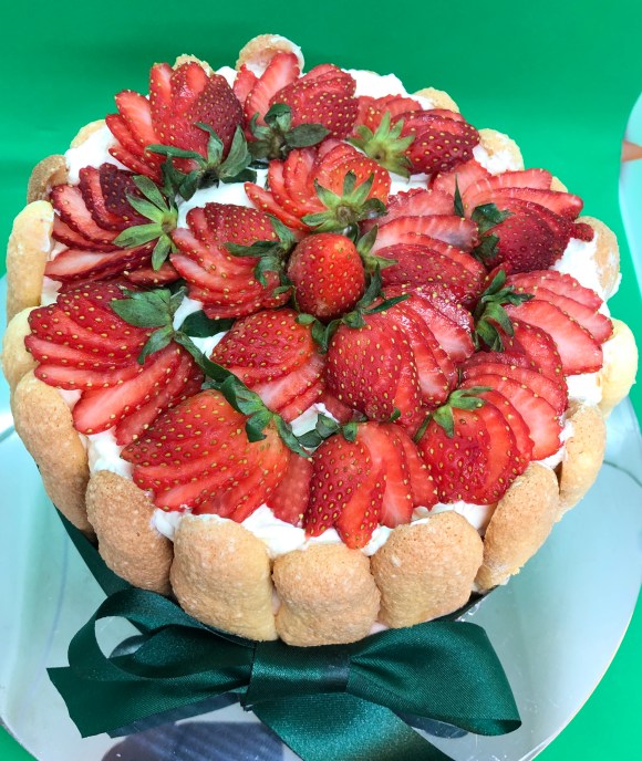 Place cellophane inside your dish from the bottom to the sides, start placing the ladyfingers all around your dish (not on the bottom, put half of the cream, put the strawberries half way of the cream facing down, add the rest of the cream, level it. Cover the top with ladyfingers.