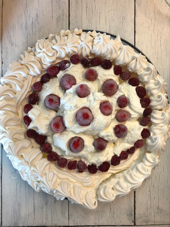 Add the whipping cream in the middle (mix the cream for a few seconds before adding it to the Meringa) and on the top the raspberries as per the pictures.